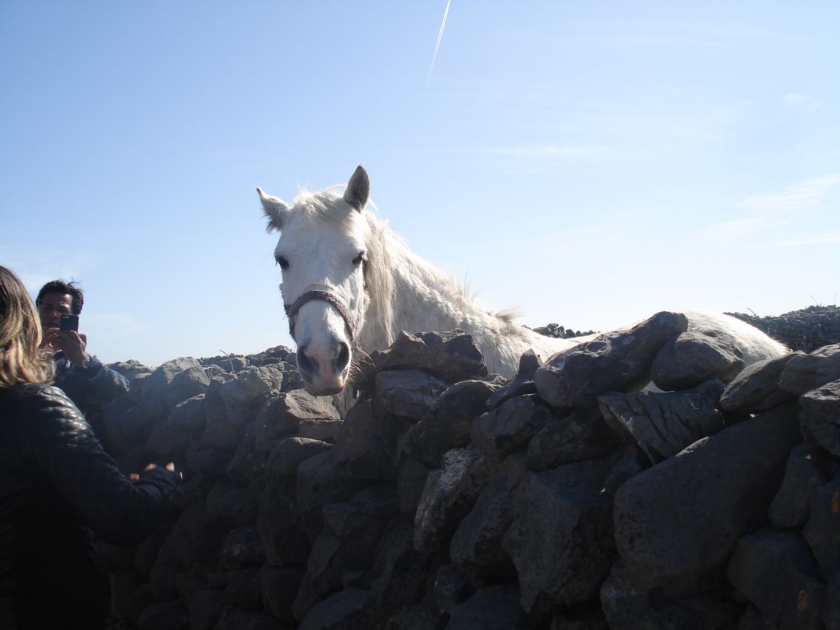 フェリーを降りるとミニバス(10ユーロ)の客引きおじさん達がいます。私たちが選んだミニバスのおじさんは賑やかで運転中もずっと話し続け、おせっかいと思うほど親切でした。このような地元の人と触れ合えるのでお勧めです。いくつかのポイント(ドン・エンガス、島の端の海岸、ナ・ショフト・シャンピル)で止まり解説してくれました。