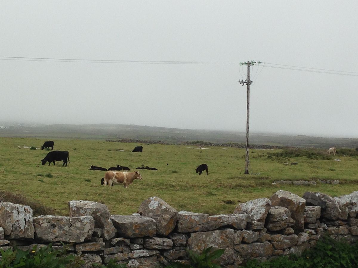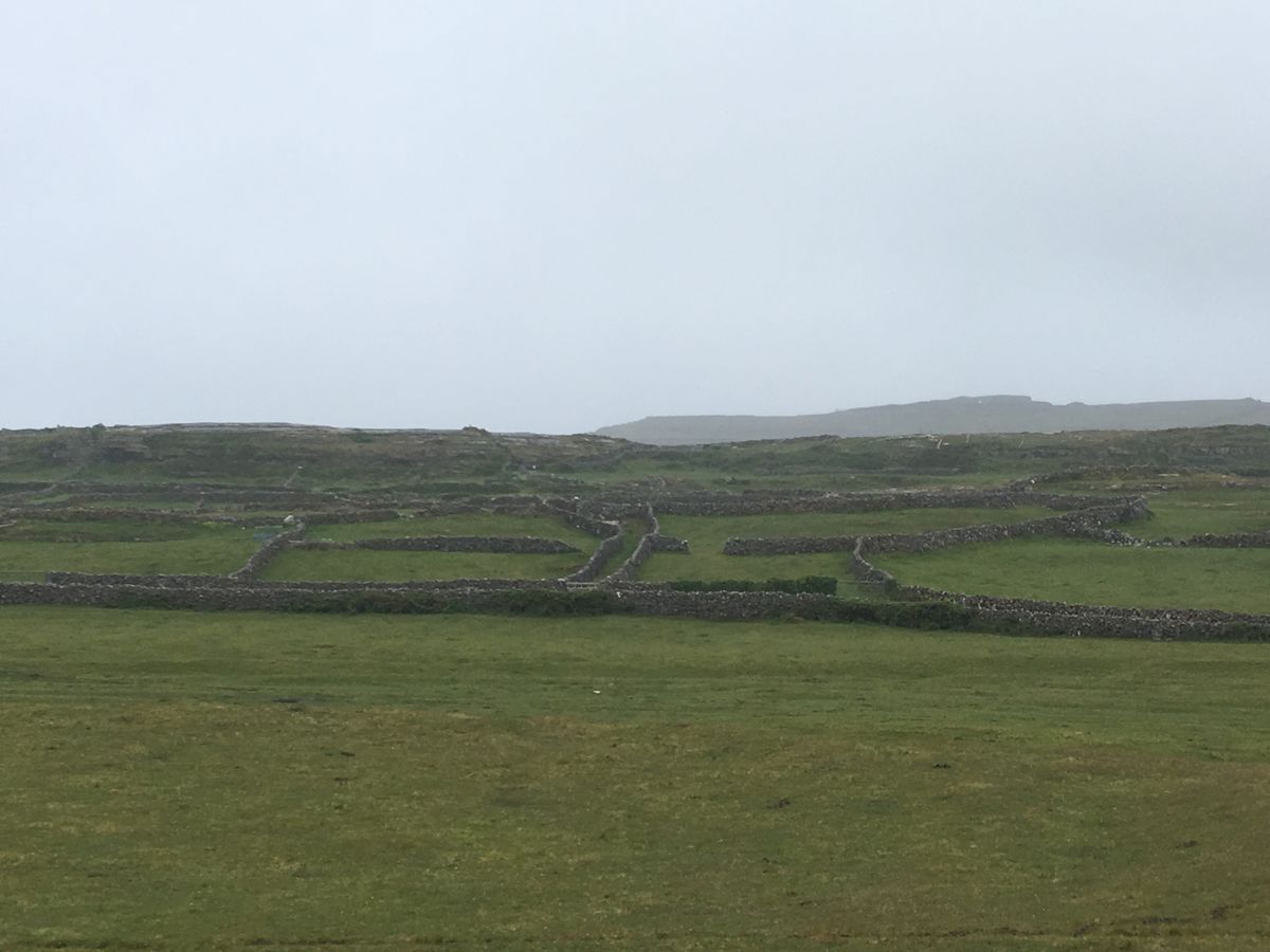 バスとフェリーを乗り継ぎ、一時間半程で島に着きました。島に着くとバスツアーの客引きに次々声をかけられます。レンターサイクルのお店に立ち寄り、自転車を借りて行く人達もたくさん見かけました。私達は勝手が分からないので、まずインフォメーションで地図をもらい、ブラブラ歩いて行く事にしました。海沿いの道をのんびり歩いていくと、時々バスや馬車や自転車などが追い越して行きます。石垣で造られた畑や牧草地、草を食む牛達、青く輝く海がずっと続きます。半分ほど過ぎた頃、ご夫婦を乗せた馬車が追い越し際、乗らないかのジェスチャーを送って来ました。誘惑に負けて便乗。「ドン・エンガス」入り口で降り、馬主に一人10ユーロ払いました。「ドン・エンガス」の絶景を楽しんだ後、軽食をとったりお土産屋さんを覗いたりしました。帰り道は、島の中央に続くウォーキングコース。歩く人なんて他に誰もいないのでこの道で間違いないのか心配になる程です。まれに、物好きな人なのか道の選択を間違った人なのか分からないけれど自転車に乗った人が走りにくそうに追い越して行きました。延々と続く道の端に積まれた石垣に感心する事しきり、気が遠くなるような作業だったことでしょう。一人の村人にお会いしただけで、後は何処までも続く石垣と緑と愛らしい花々と牛達と青い空を眺めながら歩き続け、無事スタート地点に戻りました。フェリーの出発まで一時間程ありましたので、パブによりビールと少し遅めにランチをとりました。たくさん歩いたので、それはそれは美味しかったです。