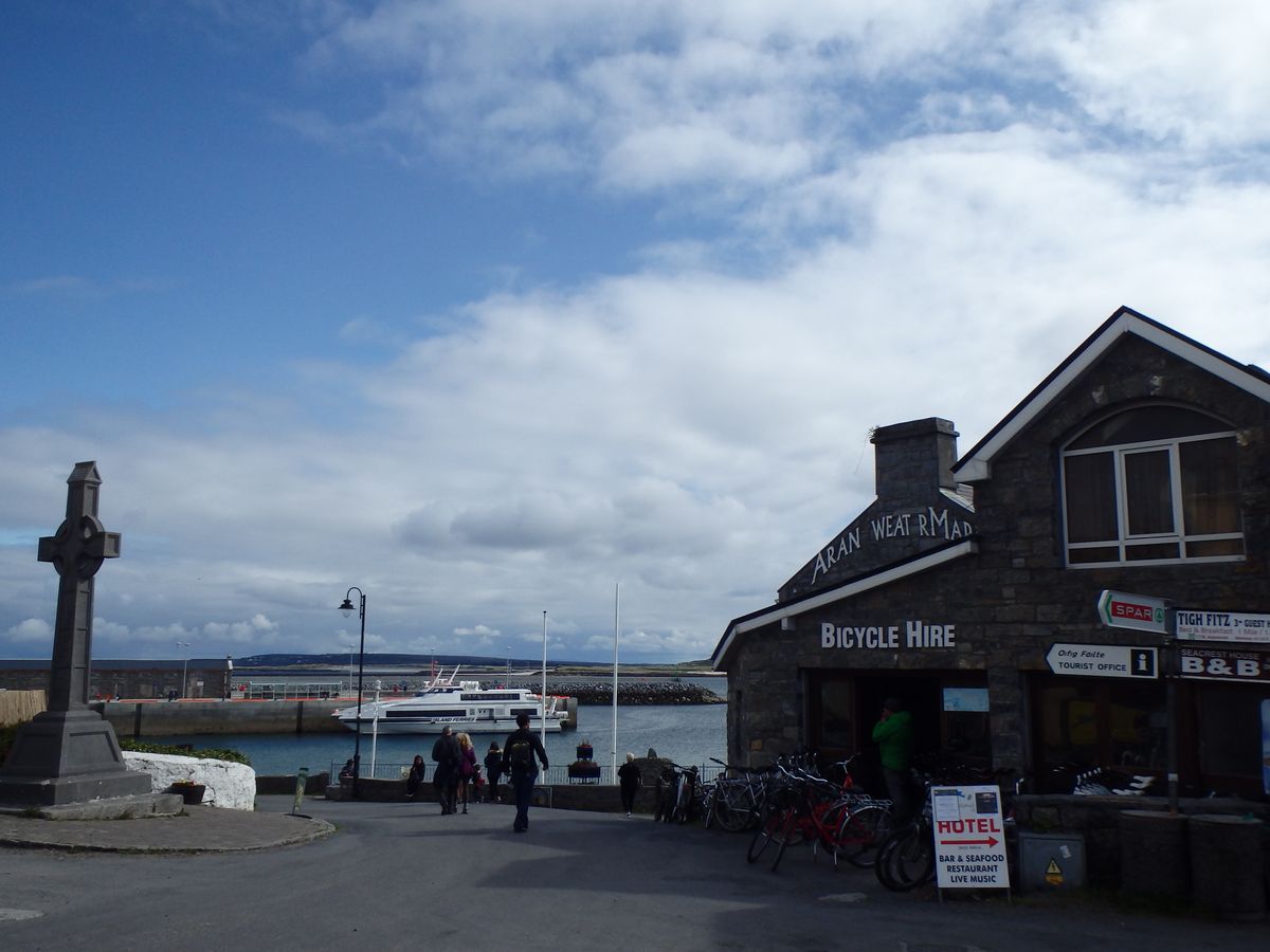 アラン諸島に着いた後、フェリー乗り場の近くに何軒かの自転車レンタル屋があります。自転車のレンタル料は10ユーロで、デポジットも10ユーロ預けなければなりません(何もなければ返却時に返ってきます)。自転車は、サドルに穴の開いていないものを選んでください。穴の開いているものに座ると、穴から水が染み出てきて、ズボンが濡れます。あと、後ろに荷物を固定できる紐の付いた自転車とそうでない自転車がありますが、夏であれば結構な汗をかくので、紐のある自転車をお勧めします。