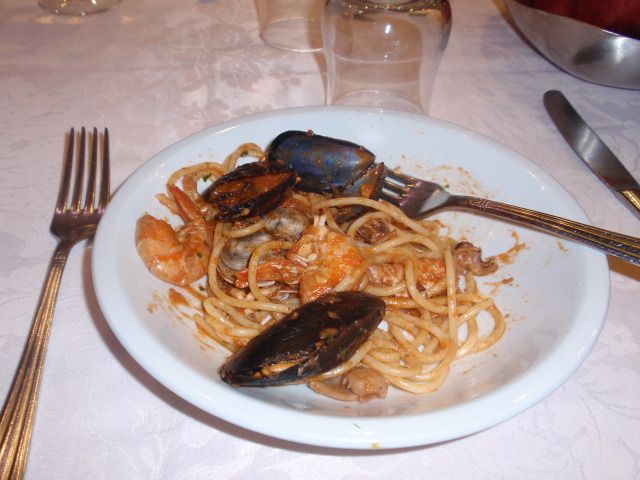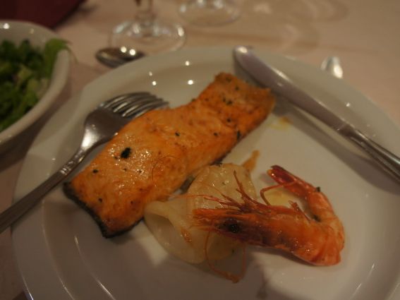 食事は魚介のコースで前菜、パスタ、メイン、デザートと結構美味しかったです。あとはテーブル毎に赤ワインが一つずつあって、白ワインと水が飲み放題です。