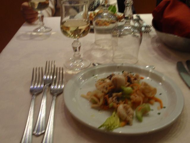申し込み時は、ちょっと高いかなと思いましたが、ローマで特に安い店を探して入る訳でもなく、ふらっと目に付いたレストランに入り、アンティパスト(前菜、今回は魚介類の盛り合わせ)、プリモ ピアッティ(第1の皿、今回は漁師風スパゲッティ)、セコンド ピアッティ(第2の皿、今回はサーモンとイカ、海老のグリル)とコントルノ(野菜サラダの付け合わせ)、ドルチェ(デザート、今回はレモンシャーベット)それにミネラルウォータとワイン飲み放題、コーヒーを飲んで、最後にチップを置いて帰るとなると、かなりの金額になると思います。加えて、カンツィーネのライブがついていると考えると、コストパフォーマンスは良いと思いました。