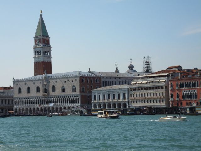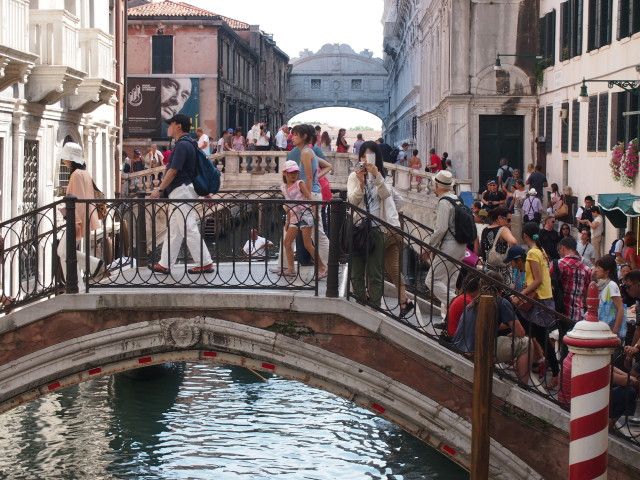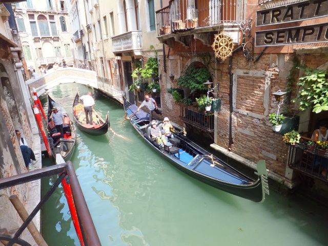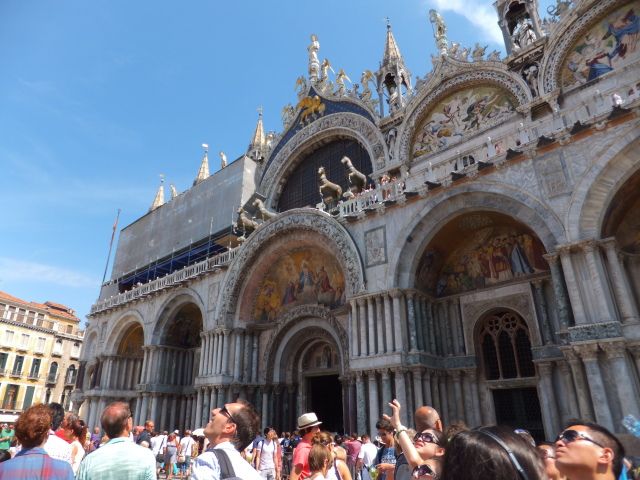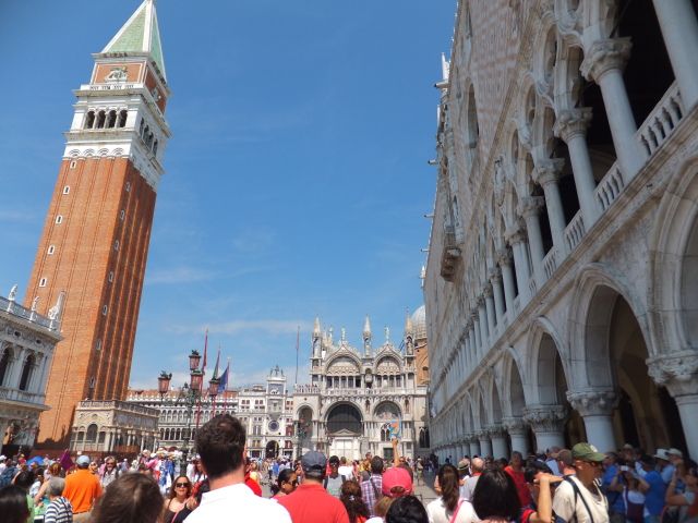 12時半頃サンマルコ広場で説明を受けた後、家族3人で観光する旨ガイドさんにお願いし、一行を離脱しました。サンマルコ寺院に入り、テラスからの景色を楽しみましたが、眼下の広場には人があふれかえっていました。この暑い中でも、さすが世界的な観光地!広場から中心部へのメインストリートはものすごく混んでいましたが、少し外れるとすいていたので、食事をしてショッピングを楽しみながら、リアルト橋まで歩きました。