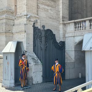 システィーナ礼拝堂を抜けると特別なルートでサン・ピエトロ大聖堂の入り口まで案内していただき、そこで大聖堂での見どころを少し解説していただいた後で解散となりました。途中でスイス衛兵にも会いました。