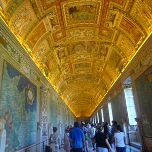 またグループ優先入場といってもすでに館内は満員状態で、とても蒸し暑く、人気の場所では満員電車状態と同じでした。ガイドさんが要所で説明してくれたので効率よく見られたと思います。個人で一般入場するとしたら、まず入場するのに並び、中にはいっても人の波に押されて、あらかじめどこに何があるかを調べておかないと疲れて終わるだけだと思います。また最後の大聖堂も、そこだけ見に来る人の行列が1km以上はあったと思いますが、我々はシスティーナ礼拝堂のあとにすぐ見られるのでとても楽でした。全工程で3時間ほどでしたが個人で一般入場で並んだら1日かかってしまうでしょう。そのうち数時間は待ち時間で費やすことになります。システィーナ礼拝堂に入る前にガイドさんがパネルで説明してくれていたので見どころやストーリーなどが理解できて大変勉強になりました。このツアーはガイド説明も役立ちますが時間の節約という点からもおすすめします。