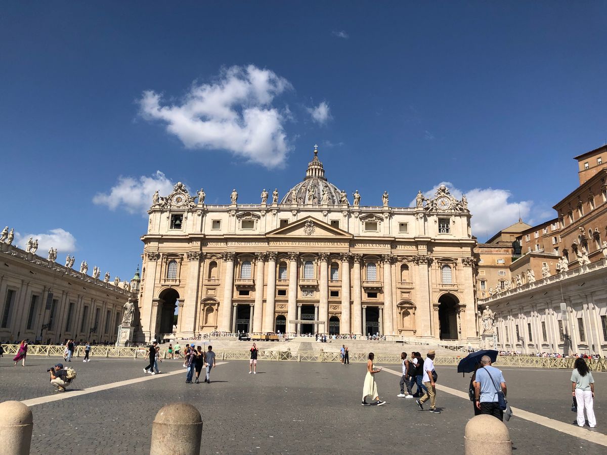 サン・ピエトロ大聖堂はガイドさんが一緒なら行列に並ばず、専用の入口から入ることができると聞いたたため、ツアーに参加しました。実際、ツアーが始まった10時頃には既にすごい行列でしたので、観光に使える時間が少なかった私たちは参加して本当によかったと思います。また、ツアーでは3つの施設を案内していただけますが、これらを自分たちだけで周ろうと思ったらまず何を見たらいいか分からないし、あんなに効率良く、バランスよく見て周るのは難しかったと思います。施設の中ではガイドさんの話し声をイヤホンで聞ける機械を使用します。途中、システィーナ礼拝堂の中で一旦バラバラになり、自由に鑑賞する時間が20分程ありましたが、集合の合図もこのイヤホンからしてくださいました。システィーナ礼拝堂の中ではおしゃべりを控える必要があるとのことで、中に入る前にタブレットの写真を見ながら詳細な説明をいただきましたが(他の団体もそのような対応を取っていました)、説明中立ちっぱなしでちょっとだけ疲れました。システィーナ礼拝堂の中に入ると端っこに座れるところがありますが、みんな座りたいから椅子取り合戦です。座る場所を確保したらゆっくり見れます。