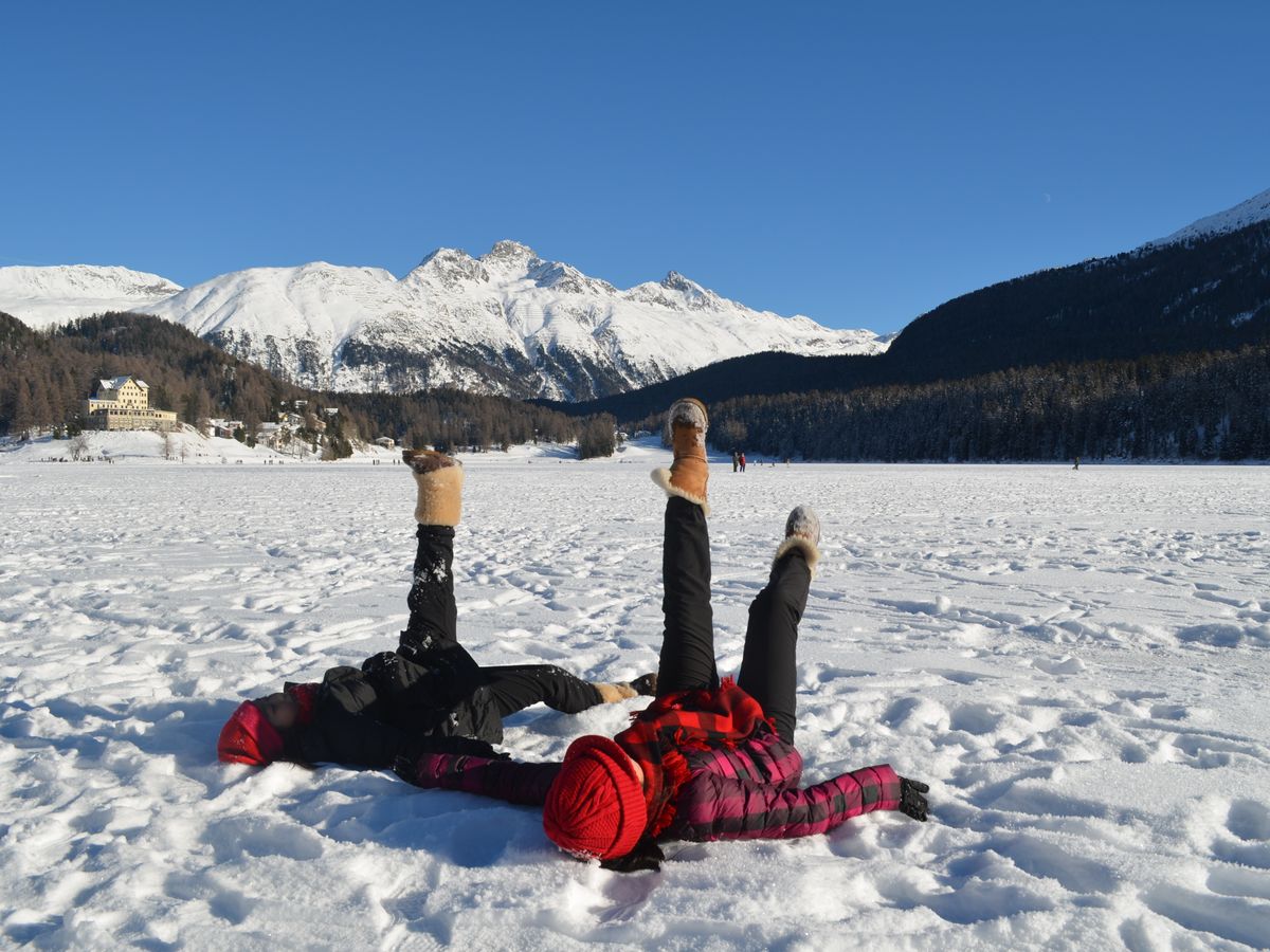 サンモリッツでは、凍てついた湖の上で雪遊び