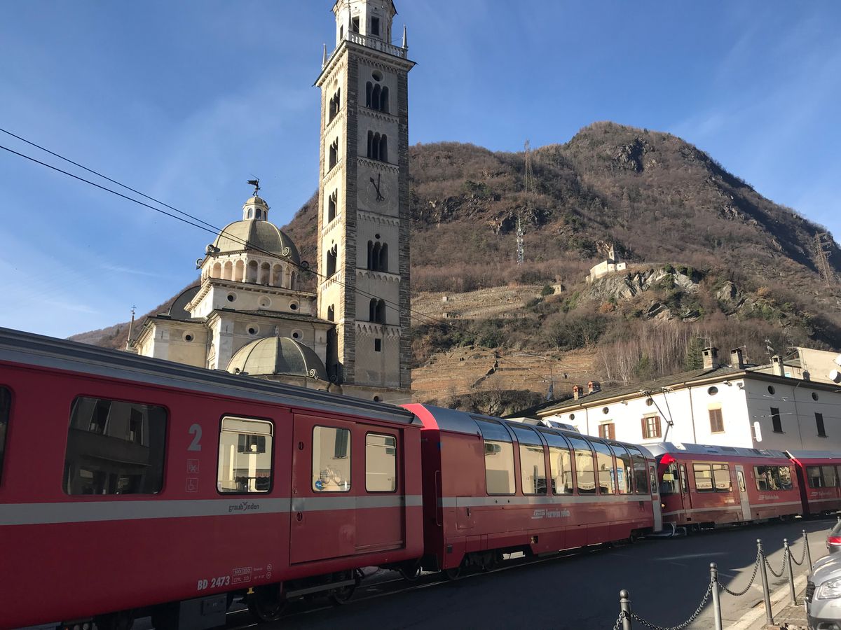 教会を出るとアルプスの山々が見え、街の中を真っ赤なベルニナ急行を通って行く姿を見ることができます!