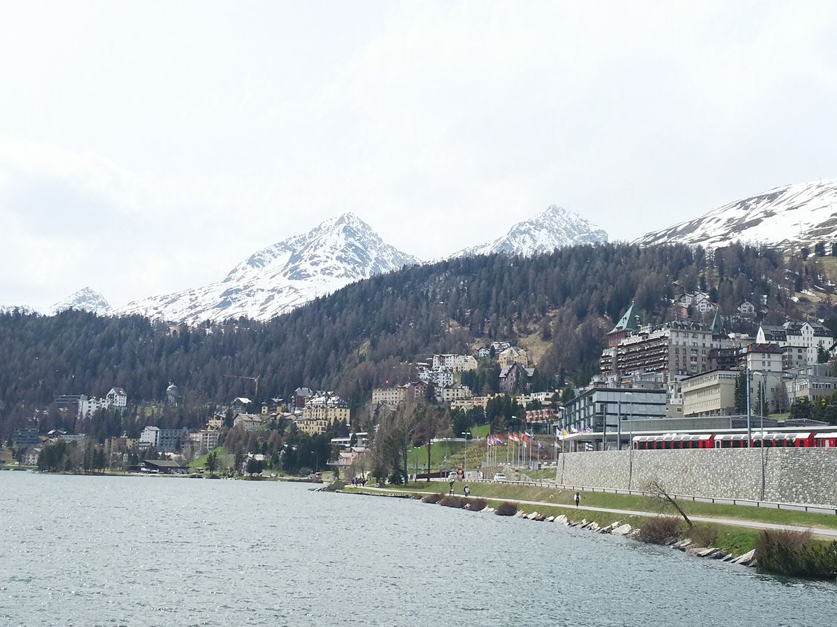 ミラノ6:20発の電車に乗ろうとしていましたが、駅の電光掲示板には列車のキャンセルの表示がありました。同じように7:20発の電車もキャンセル表示で嫌な予感はしていましたが8:20発の電車も30分遅れて発車しました。そこで緊急連絡先にお電話させていただき、ご丁寧な対応をしていただきました。そして、乗った電車も1駅目で1時間ほど停車・・・。結果としてスタッフの方のご丁寧な対応のおかげで、サンモリッツに到着できましたが、滞在時間は1時間ほどでした。5月初めのサンモリッツは閑散期のようで特に見るべき場所もなかったのでよしとします。