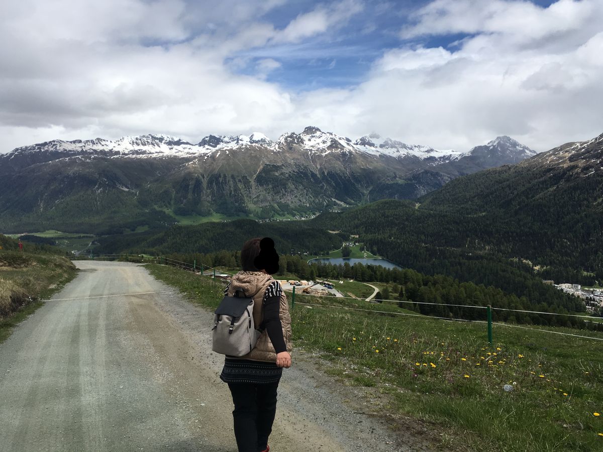 サンモリッツではケーブルカーにのって山の中腹にあがり、ハイキングしながら40分くらいで町中につきました。
