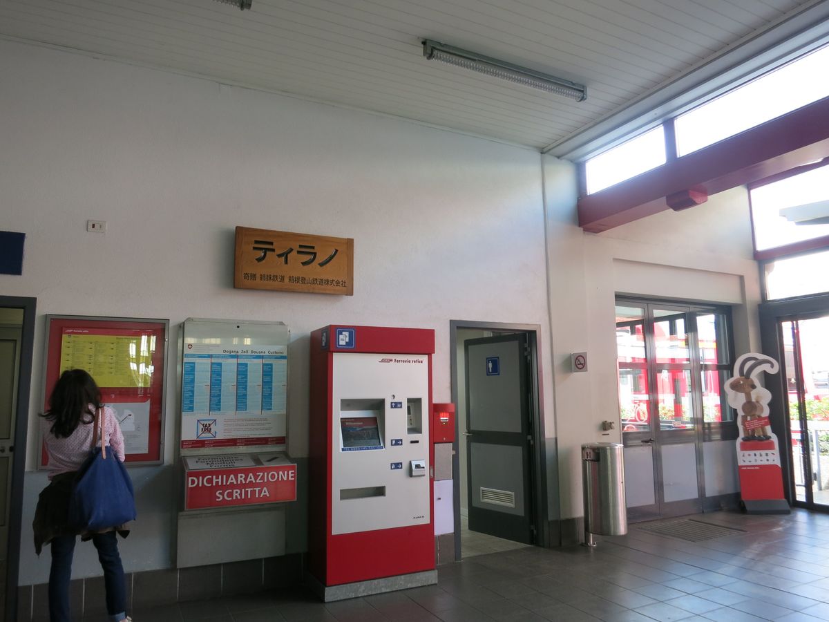 列車に乗るティラノ駅には、伊豆箱根鉄道から寄贈されたティラノという木の看板があり、笑えました。ミラノが連日35℃越えだったので、サンモリッツに向かう列車は涼しくて最高でした。2時間はあっという間でした。