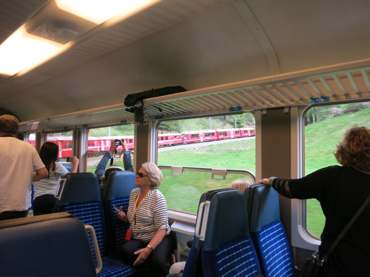進行方向に向かって右側車窓にも左側車窓にも綺麗な景観は広がっているので、乗客は左右行ったり来たりを繰り返して写真撮影に夢中でした(ティラーノ→サンモリッツ路線ではどちらかと言えば進行方向に向かって左側に座る方が撮影ポイントが多くておすすめ)。ツアーで1車両貸し切りでしたが、ツアー参加者がかなり多くてほとんど相席状態でした。路線の中間地点辺りを過ぎるとみんな写真撮影に疲れたのか満足したのか、おとなしく席に座るようになりました。