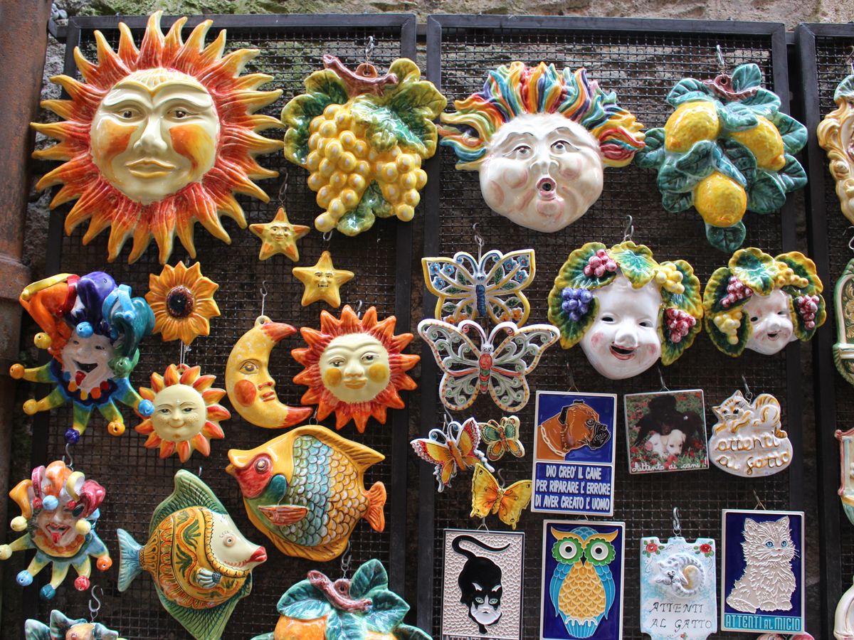 街歩きを始めるとレストランや革製品、木工や陶器などの素敵なお店が沢山あり、ピノッキオのお人形がベンチに座っていたり、塔や屋根の上にブリキの玩具のような飾りがあったり、可愛いお土産やさんがあったりとメルヘンの世界に入り込んだような気分でした。