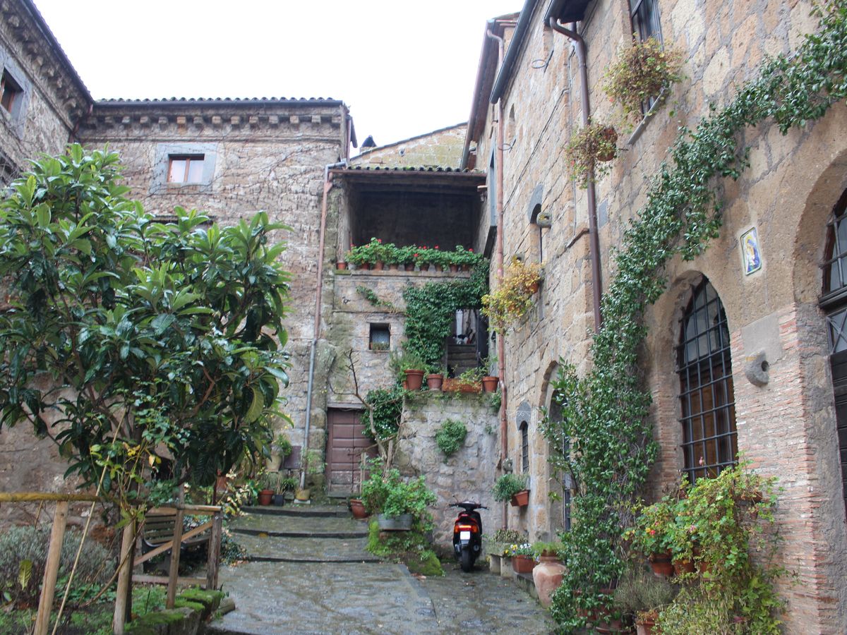 チヴィタへ続く橋を渡りさらに登っていくと古い建物ときれいな草花が出迎えてくれます。