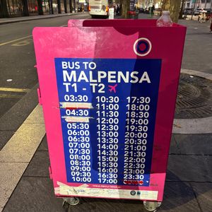 オリンピック期間だったので、行きはマルペンサ空港地下一階のシェラトン付近から乗車。地図では場所が分からず、海外あるある?で2〜3人の現地の人に聞いたら分かった。シェラトン入口の有るフロアーにテラヴィジョンのチケット売り場があり、その近くにバス停があった。帰りはミラノ中央駅に向かって左側にバス乗り場がある。往復ともにスムーズに乗れた方だと思う。