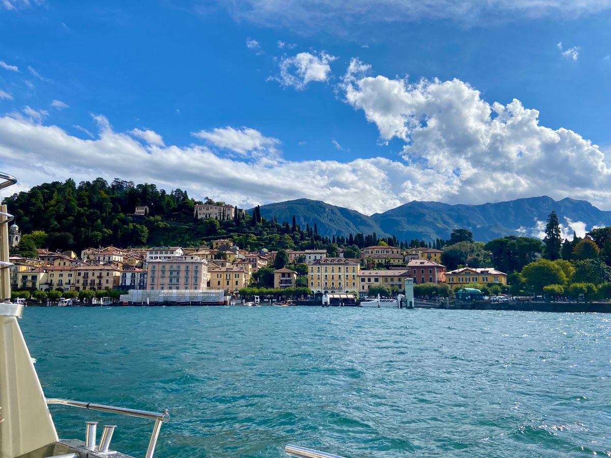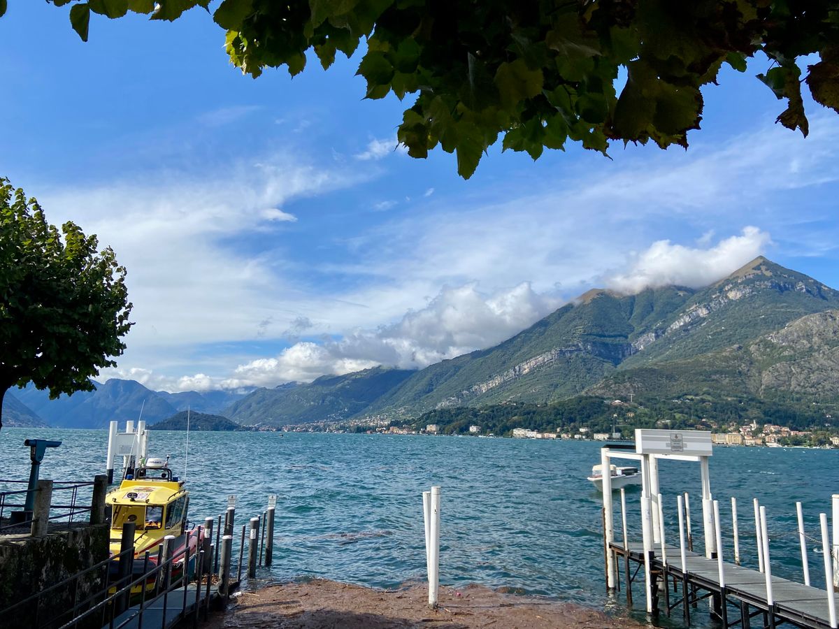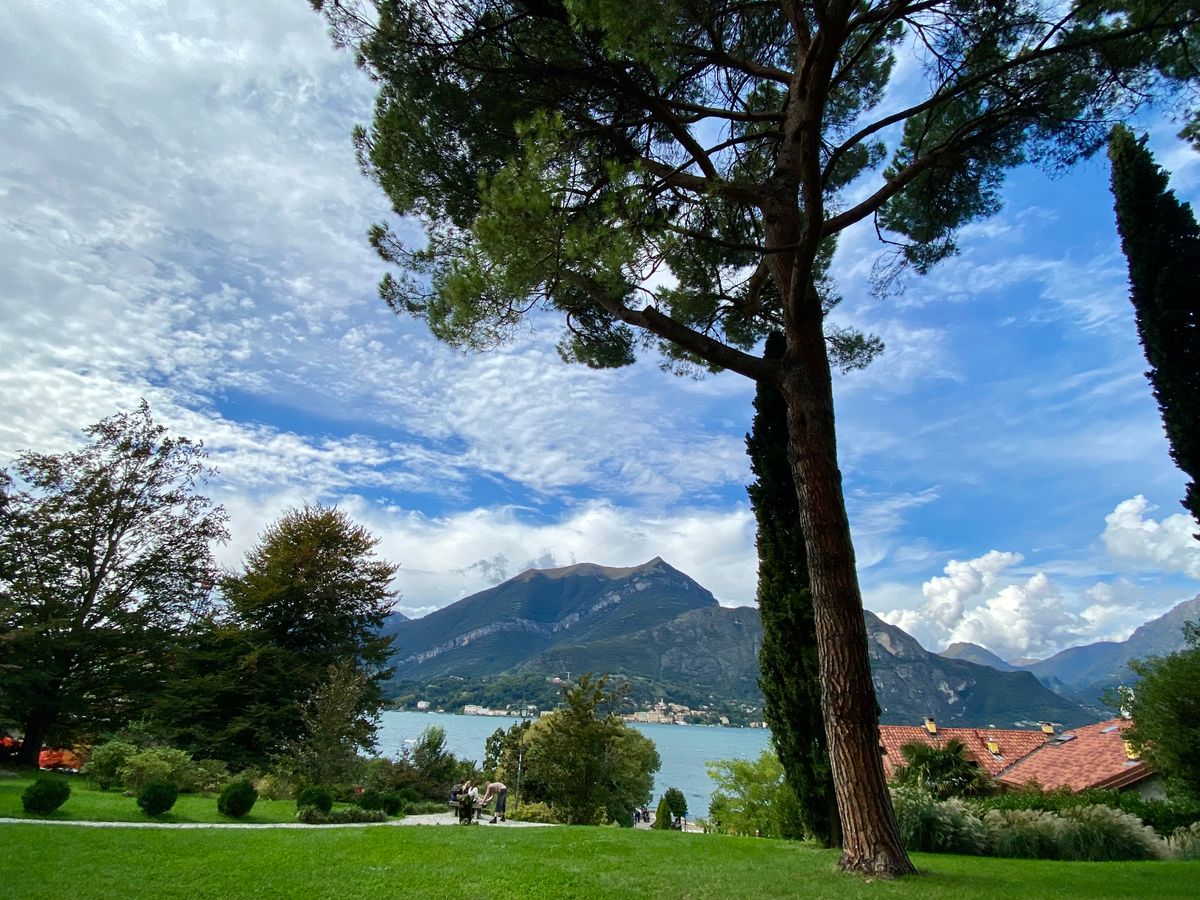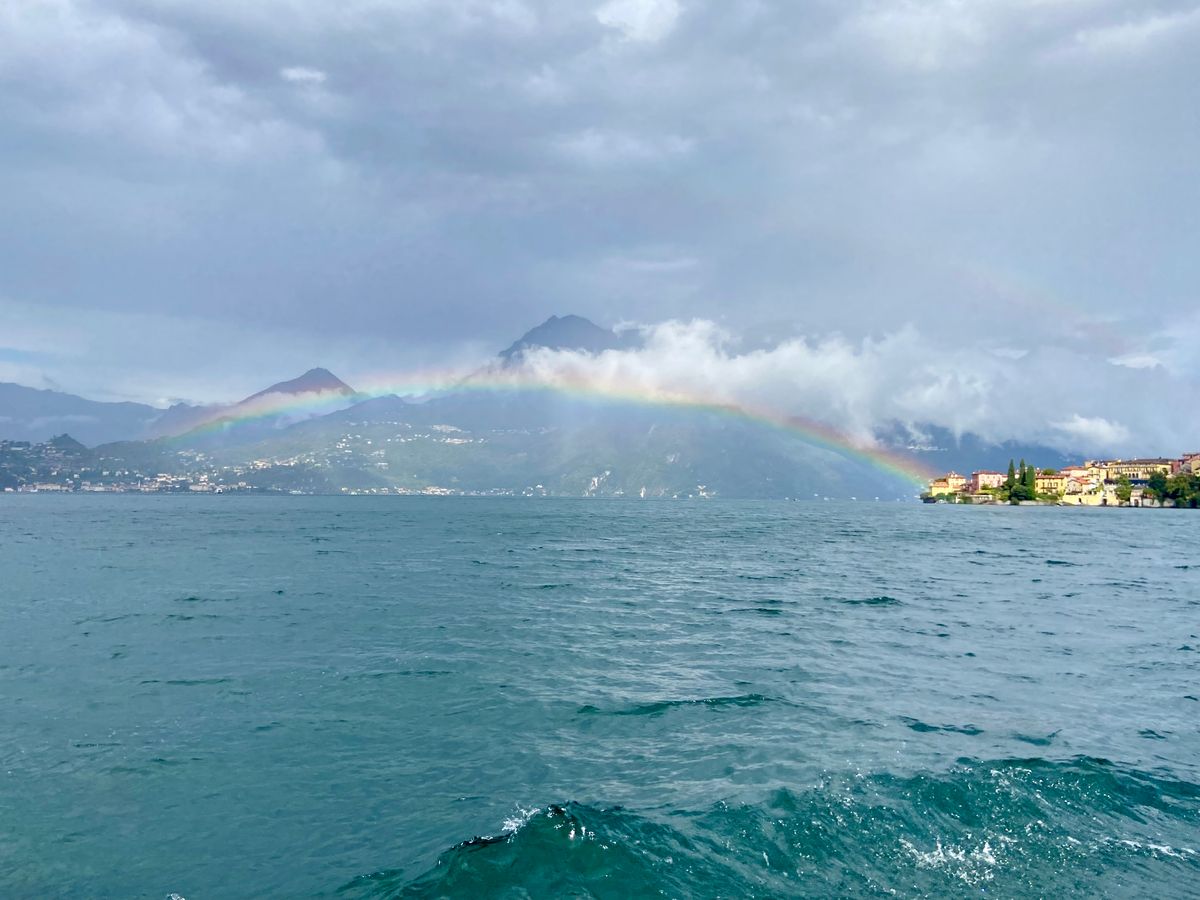 当日、湖水地方は豪雨の予報でした。でも幸い、現地に着くと薄ら陽が差し始め、クルーズ船に乗ってしばらくすると、美しい虹が立ちました。雲間に青空も垣間見え、絶好の観光日和になりました。気温は15度を下回り、厚手のセーターが欲しいほどでした。1時間ほどでベッラージョの船着場に着きました。土産物や服飾を扱う小体な店舗が軒を連ねていましたが、目ぼしいものは何もありません。いささか退屈して、オリーブ畑の中を越えて石畳の道を下っていくと、観光客がほとんどいない別荘地になっており、静かな船泊に出ました。遠くに急峻な山が聳え、翡翠色の湖水がヨットの船端を洗っていました。絶景です。ぜひここまで足を伸ばしてください。