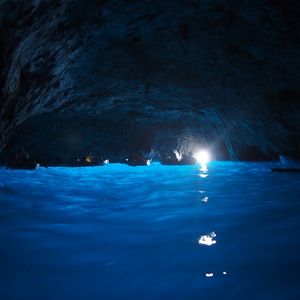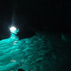 私たちの順番となりカメラを構えてボートに乗り込みました。入り口は想像と違い、すごく狭かったです...。体を倒してドキドキしながら洞窟に入ると、そこには素晴らしい光景が待っていました!小さな入り口から差し込む外光に照らし出される海の青さは、言葉で表現できない美しさです。
