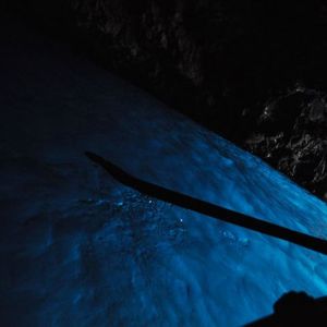 洞窟内はとても狭く、思っていたほどの感動ではありませんでしたが、海面が光の屈折により青く光っていました。