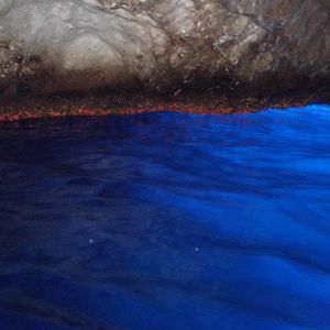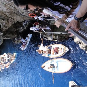 青の洞窟に入れる確率は極めて低いと聞いていいたので、入れなくて当然と思い、このツアーに参加しました。1時間ほど洞窟前の階段にて、入るのを待ちました。4人乗りの小さなボートに乗って、洞窟に入ります。ボートはとっても小さいので、ねっ転がって入る形になります。汚れてもOKな服装がお勧めです。中に入ると、真っ青な水面がキラキラしていました。しかし、態勢が寝っころがっているので、しっかりと眺めている余裕はありませんでした。洞窟にいた時間は3分くらい~5分です。あまりゆっくりとはみれませんでした。また、私が入った後、波が高くなったため、そのあとに並んでいた方々は見る事ができませんでした。