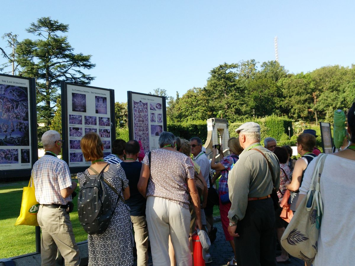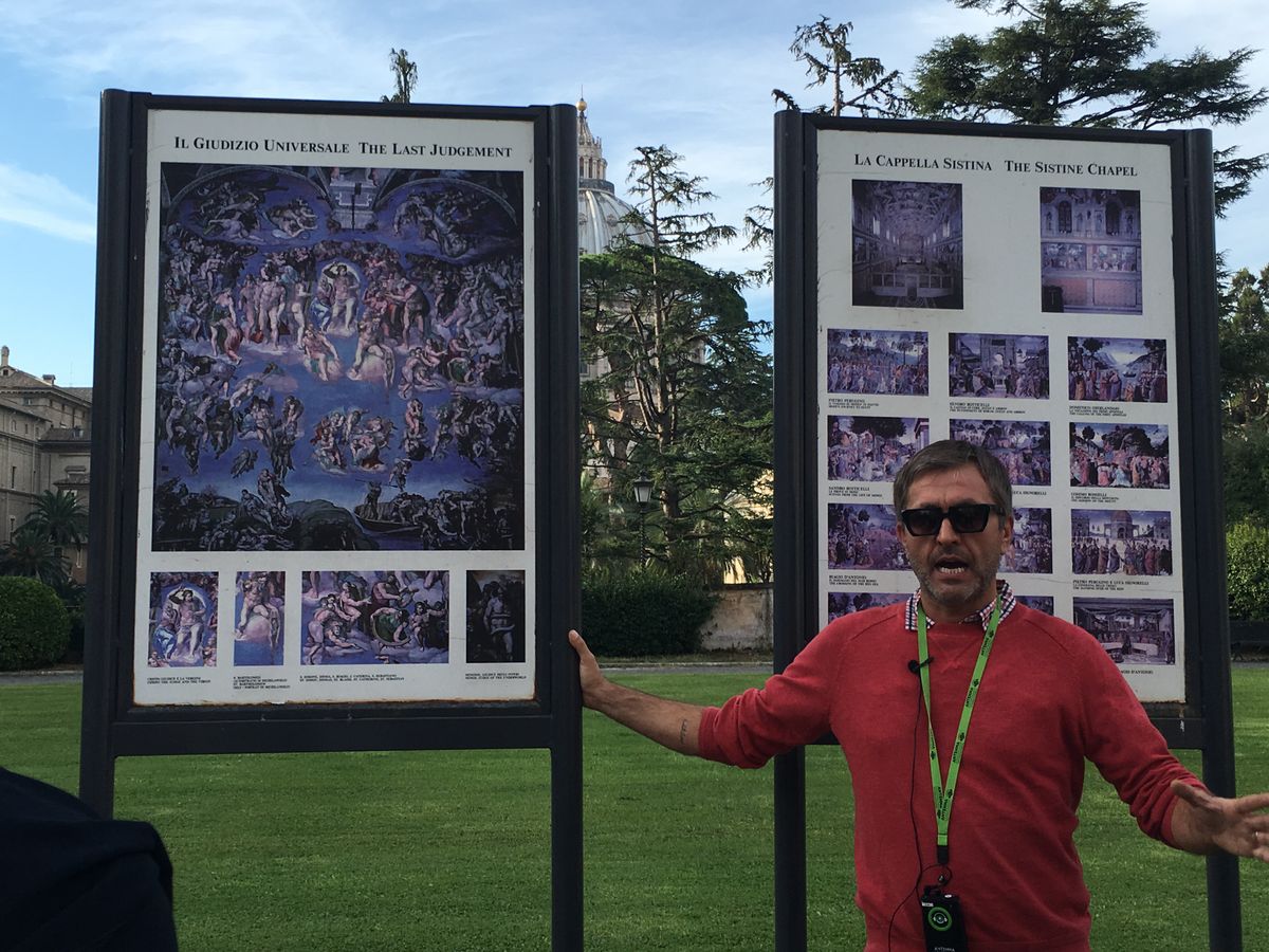 ”システィーナ礼拝堂内でのガイドの説明は禁止されております。よってすべてのガイド付きツアーは、やむなく絵画の看板がある中庭であらかじめの説明をしております。幣社ガイドは”最後の審判”をより深く、わかりやすく鑑賞いただけるよう、描かれている旧約聖書の意味や構成、歴史等など説明をしております。