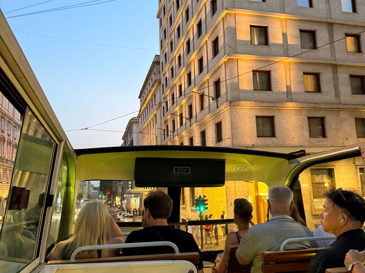 ツアーは予定通りの時間に開始された。スタッフの方が笑顔で迎えてくれた。バスにのると、おしぼりとイヤホンを渡してくれて、ツアーに含まれるメニューのパニーニの写真を見せてくれた。バス席の横の穴にイヤホンを差してチャンネルを合わせるとバスの通過場所に合わせて日本語での説明が流れた。ツアーなしで観光していたため、多くの名所の説明が聞けて非常に良かった!半ばでバスを20分停車し、その場のキッチンカーから温かいパニーニとビールをもらう!パニーニも大変美味しかったです。ドリンクはビールやソフトドリンクから選べました!お値段も安いし夜の景色も綺麗だし大満足のナイトツアーでした。