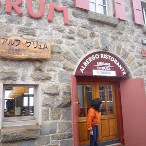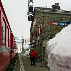 列車は定刻にキアベンナに向かう。コモ湖、マジョーレ湖、切り立つ山々を抜けてキアベンナに到着。ここはアルプスの麓。駅前には山を指さす像が飾られていたが、誰がどの山を指しているのかチンプンカンプン。キアベンナからはポストバスでサンモリッツに向かえとの指示。バス出発までは余裕があり、駅前のカフェでジェラートを食べながら待った。周りは山に囲まれ、落ち着いた町だ。そのうち、黄色の車体にポストバスがやって来た。郵便配達よろしく、村々の停留所で登山客を昇降させながら、サンモリッツに向かう。つまり登山客の配達ゆえなのだろう。くねくねした山道だが、道は整備され、バス旅行も快適そのもの。最初は少なかった乗客も、停留所に着くたびに登山客が乗り込み、ほぼ満席。バスは徐々に高地を走り、サンモリッツ駅に着いた。