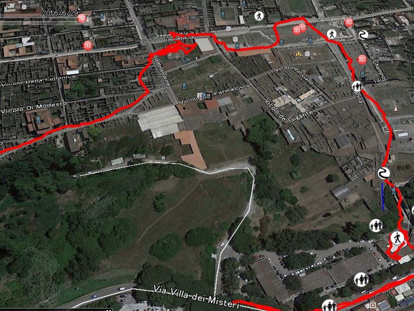 コースとしては、共和国広場で集合後、豪華観光バス(液晶パネル付き革張り参加15人前後)でカプリ島・青の洞窟の方と一緒にナポリ港に寄ってポンペイの遺跡に行きました。バスの中では要所要所で分かりやすい日本語(日本の方なので当然?)で歴史を含む説明をして頂き、ローマに来て5日目に聞く日本語の説明でイタリアに来たのだなと感激、、高速道路では行きかえりともトイレ休憩(無料)も組まれておりお土産を買う時間もありました。ポンペイの遺跡は2時間程度と全体のツアー時間からは少ないと思いましたが、エリアマップⅥ、Ⅶ、Ⅷ、と港からの入り口からフォロ、市場、浴場、パン屋、出口に近くにある秘儀荘を通って昼食に行きました。エリアⅠからⅤとⅨの闘技場とか体育場など回っていないところも結構ありますが充分堪能できました。今回の回った GPS の移動も付けておきます参考にしてください。ナポリに移動後も渋滞が少なかったのか一時間以上の散策時間がありガッレリーア ウンベルトプリーモ、ヌオーヴォ城などを見て、暑さしのぎのジェラードを食べながら回ることができました。5月末のツアーでしたが、これからもっと暑くなると思います、暑さ対策と歩きやすい履物で行かれることをお勧めします。追加情報、ナポリ遺跡でナポリのガイドの方が一緒に回られますが、ローマのガイドさんがナポリでガイドする場合の取り決めだそうです。また当日は天気も良く青の洞窟の方も中に入る事が出来たようです。