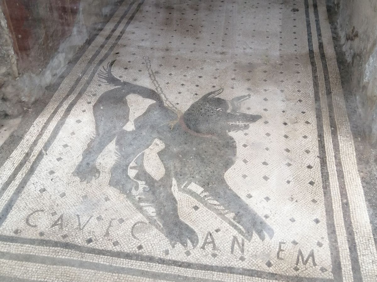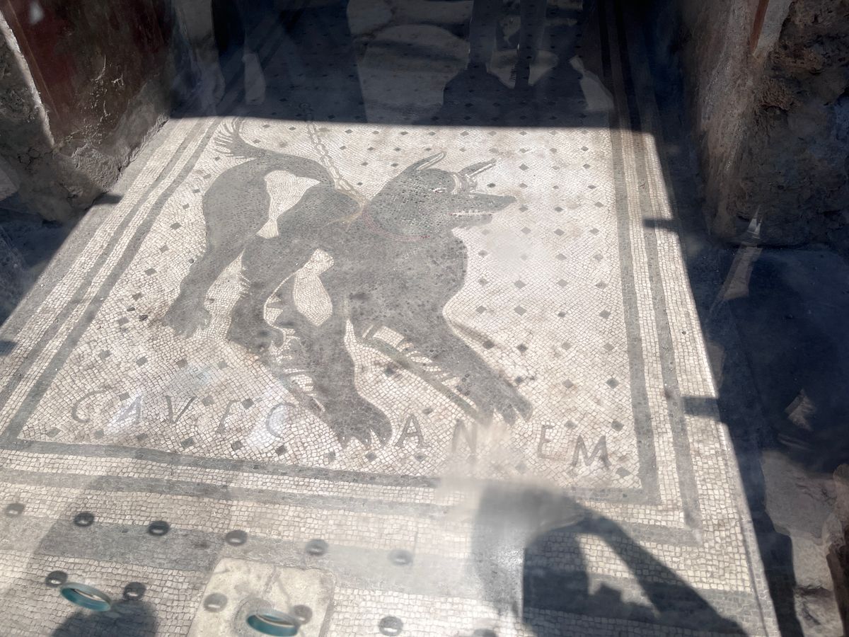 ポンペイ遺跡の見学コースはオフィシャルでも2時間コース、4時間コース、1日コースなどコースの距離に応じて用意されているようですが、こちらのツアーでは、マリーナ門から入って公共浴場や神殿を見てからフォロへ。またフォロでは市場やバジリカをみてから更に「猛犬に注意」のモザイクがある詩人の家やパン屋の辺りを巡り、エルコラーノ門から出て、共同墓地の前を通り秘儀荘に至る約2時間のコースとなります。