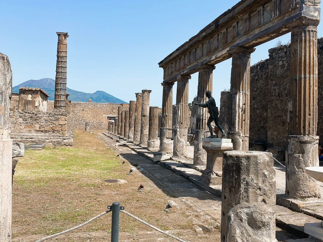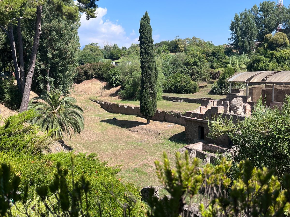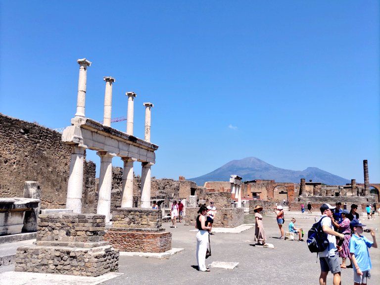 世界的な異常気象でイタリアも猛暑の中、遺跡の見学中は日陰が少ないので、日焼け止めやサングラス、帽子、日傘などを用意すると良いでしょう。あと飲み水は必携です。この日は快晴でフォロからヴェスビオ火山が綺麗に見えました。でも暑かったです。