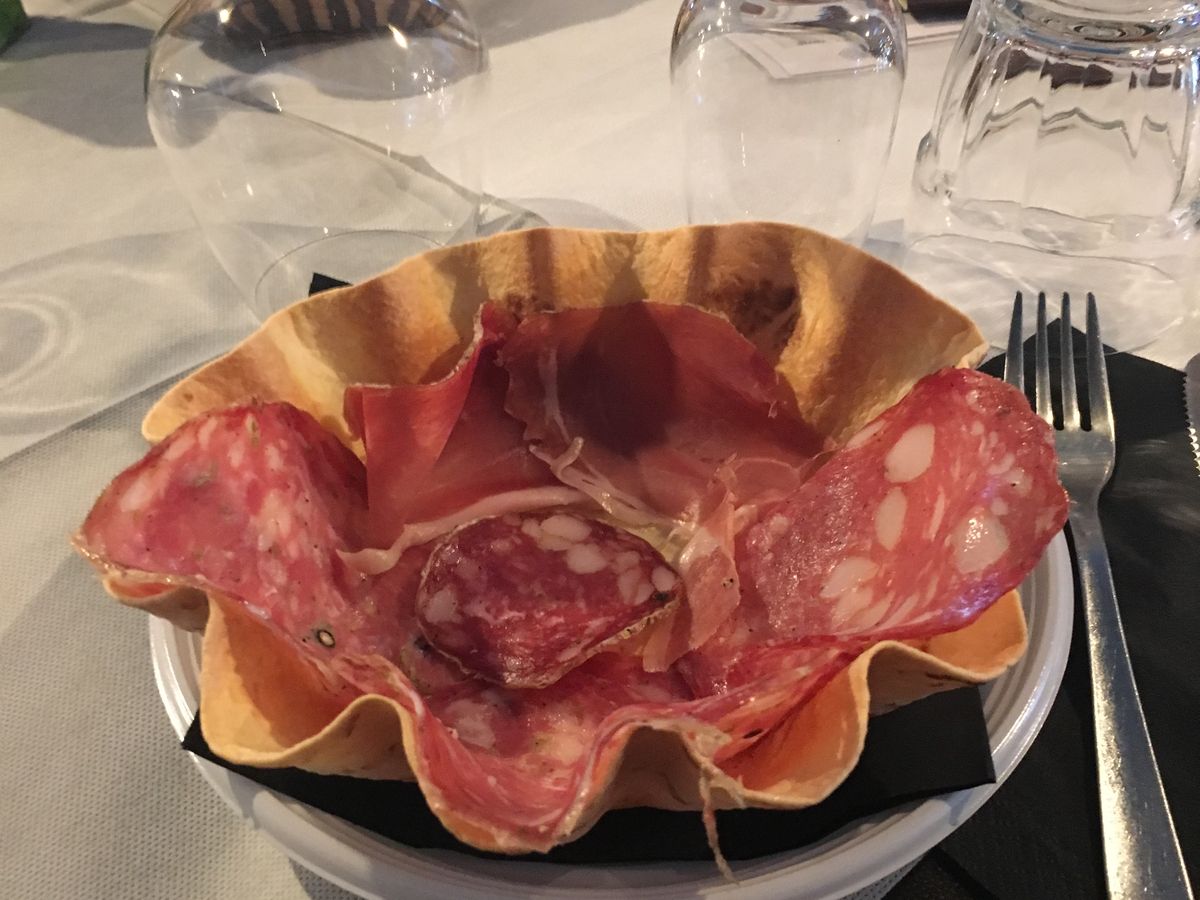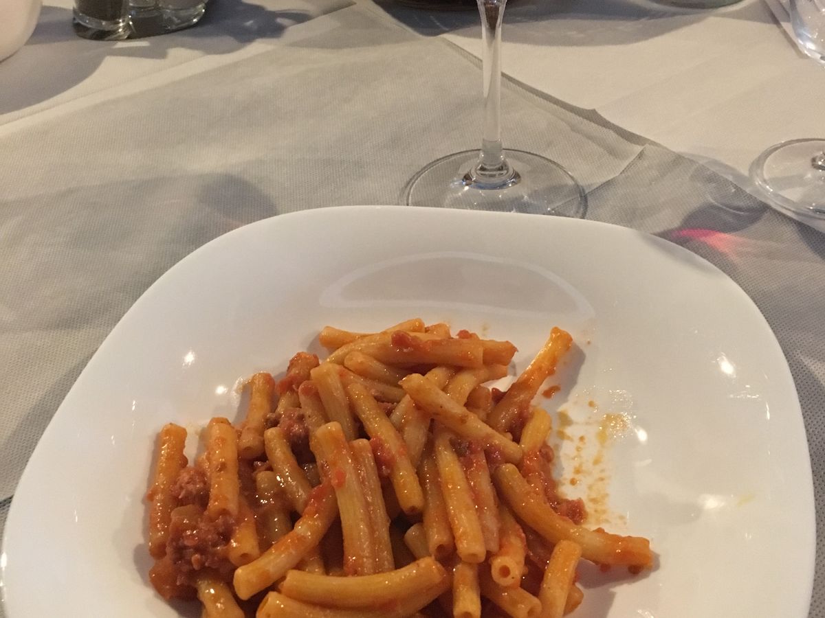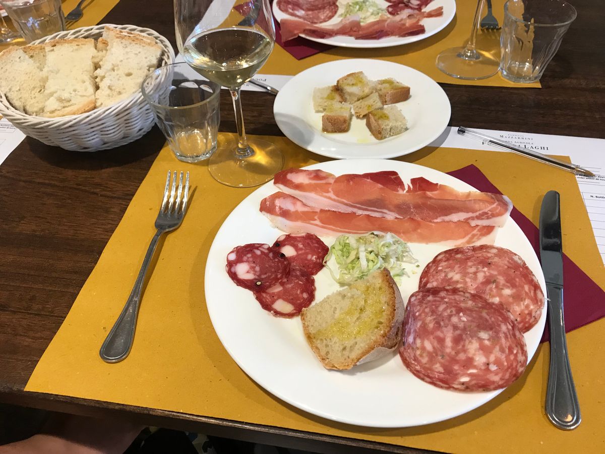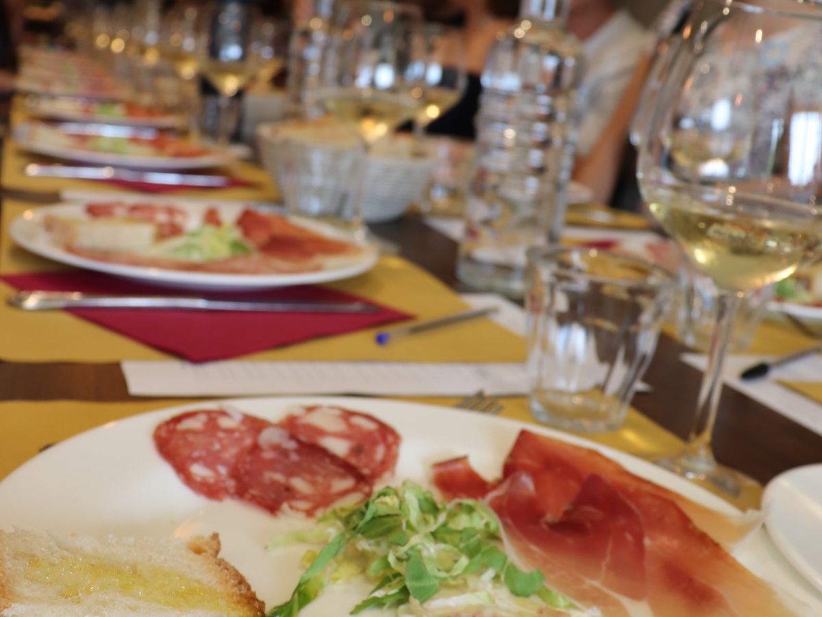 サンジミニャーノは白ワインの有名なところで、昼食時のドリンクでサンジミニャーノの白ワインとキャンティクラシコ(赤ワイン)が出ました。メニューはサラミの盛り合わせ、アマトリチャーナの様なパスタ、ドルチェです。ワインテイスティングは有料ですができます。