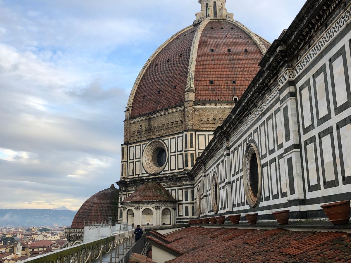 途中のテラスへつながる道も、ほかの客にはドアを閉じて私たちだけが通ることができました。400段を超える階段をのぼり、ドゥオーモの頂上にたどりつくと、360度ヴューが!