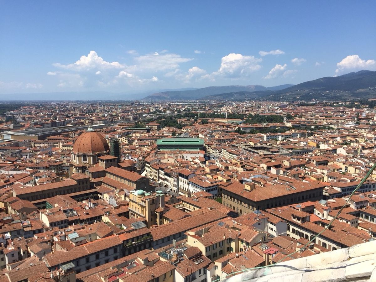 螺旋階段は薄暗く狭く、最後の方はとても急です。但し屋内なので暑すぎると言う事はなく蒸し暑い程度でした。長い階段を上がりきった後に見る屋上からのフィレンツェ一望は、達成感もありとてもとてもきれいでした!!