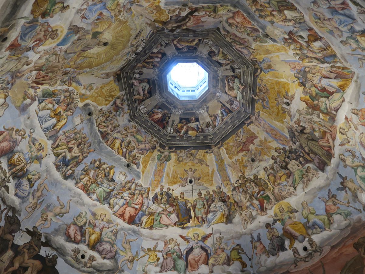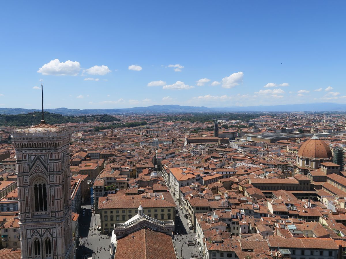 屋上テラスまでは予定通り。風が少し強かったですがフィレンツェの市街が眼下に見えて感激しました。本来は私たち4人はここでツアーから離脱し、クーポラには登らない(メンバーの足の状態が万全ではなかったので)とガイドさんに事前に伝えていたのですが、皆さん、どんどんクーポラに登り始め、我々はどこから下ればよいか分からず、結局、皆さんの後について登ることになりました。結果的にこれが大正解!! 晴れ渡った青空の下、フィレンツェの市街を一望のもとに収めることが出来ました。大変素晴らしい経験となりました。
