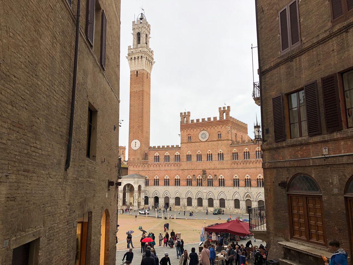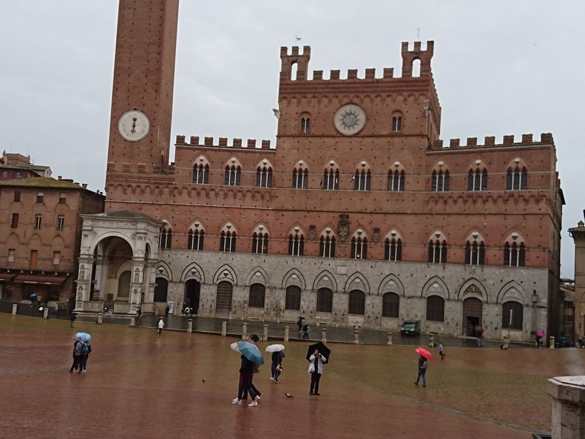 まずシエナに到着、しかしあいにくの大雨、しかしすぐに止み、シエナを出る頃には太陽が見えました。雨具は持参しなかったが道端で5€で折りたたみ傘を購入。バスの停留所から広場まで少し歩かなくてはならないため注意です。