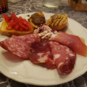 おーっ!ワインのアテにしては豪華すぎるチーズ、ハム、パン、真っ赤なトマトカプレーゼ!先ずは、白ワインコース①BALLUN ロゼのスプマンテ②Da FUGNANO DOCG③BOMBE2015 赤ワインコース①DONNA GINA②Le ga mi③Da FUGNANO DOCG CHIANTIを戴きました。案内してくださったワイナリーの方がぶどう畑だけでは駄目でオリーブも大事、何よりも森が大切で、森からの恵みがワインに反映されるそうです。美味しいワインと美味しい食事をありがとう!