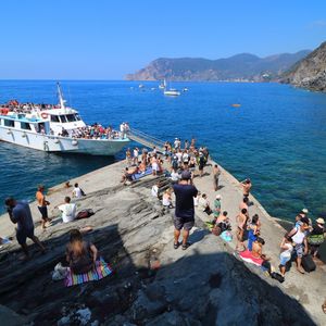 チンクエテッレに向かう途中バスからアルプスが見えたりと感動から始まり、感動で終わるツアーです。また、絶景に癒され、大満足のツアーです。日本語ガイドは日本人の方なので、安心して一日過ごすことができました。ユネスコに登録されてから観光客でいっぱいのチンクエテッレですが景色を見てるだけでとても癒され、観光客でいっぱいでもお店は沢山あるので問題ないと思いました。ただトイレを探すのは苦労しました。公衆トイレは有料もしくはレストランに入って何かオーダーすれば使えます。ゴミ箱は至るとこえろにあります。 絶壁に建つ建物ももちろんですが、海がとても綺麗でちょっと足まで入ってみましたが全然ベタベタしなくて気持ちいいです。島々の移動は電車、ボートです。(ボートは45分程乗るので寒くなりました。)自力ではなかなか簡単には行けないとこなのでツアーで行くべきだと思います。時間もしっかりとってくれるのでゆっくり過ごせます。