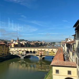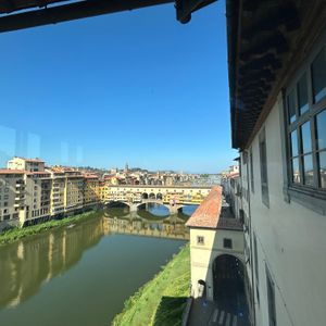 ホテルが駅とドオモ(?)の中間だったので、数分でドオモ周りからよく見れました。展望台までは階段とのこと、登る気はありませんでした。美術館、入場券の時間まで数分待機、著名な絵画に圧倒されました。2回からベッキオ橋も見られ、昼食もテラスで取れました。
