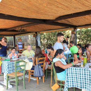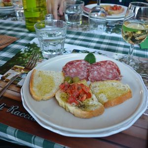 食べものはサラミの前菜・ブルスケッタに、メインがトマト味のひき肉のペンネ、プチケーキのデザート、ワインはたっぷり。