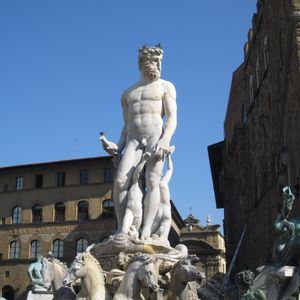 サンタ・マリア・ノヴェッラ駅からウフィツィ美術館までの道々、ガイドさんのお話を聞きながらいろいろなところを巡りますが、その中に新市場(Mercato Nuovo「麦わら市場」)のイノシシの噴水(Fontana del Porcellino)があります。口から流れ出る水に乗って吸水口にコインがスポッと入れば、またここに来られるという言い伝えがあるそうです。ウフィツィ美術館にあるこのイノシシのオリジナルも見てきました。