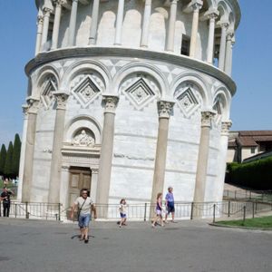 まず広場に着いて最初に目に入るのが洗礼堂です。そして、その後方の聖堂の脇から斜塔がチラリと建っています。見えた瞬間に声をあげてしまうほど感動して、早足で斜塔めがけてしまいました。周りはこの斜塔を支えるポーズの写真を撮ってる観光客だらけで、私たちもつかさず写真を撮りました。