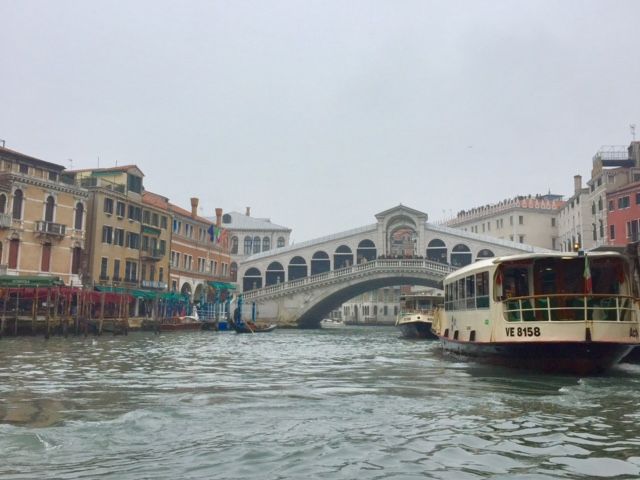 ゴンドラは、サン・マルコ広場近くを出発してカナルグランデに出て、出発地点に戻ってくる三十分程度のコース。リアルト橋を背景にゴンドラから写真を撮れたりしました。