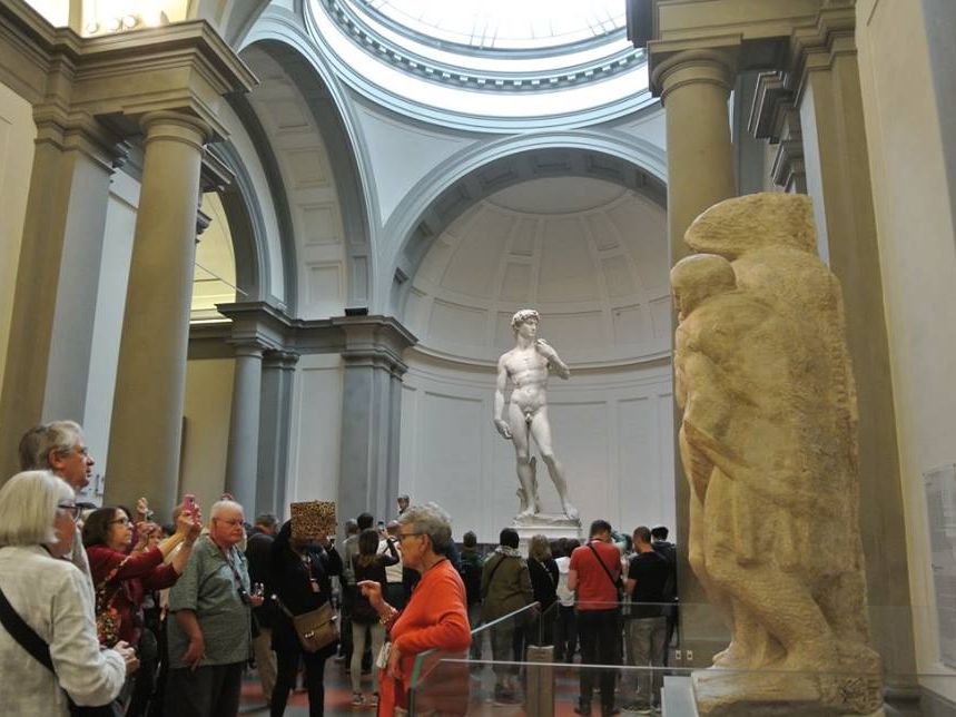 展示されているダビデ像の迫力には圧倒されました。像の前の腰かけに1時間近く座って眺めていました。観光客が少なく、正直なところ、予約せずとも楽に入れたようでしたが、観光シーズンには、予約しておいたほうがいいと思います。ただし…、受付の初老の男性に印刷したバウチャーを手渡したところ、「これはバウチャーなの?」といぶかしい反応をされました。受付にあった予約メモに小生が自分の名前を見つけだすことができたため、ようやく入場券の発行となりました。中年男性は老眼? バウチャーの文字を大きくしたほうがいいと思います。