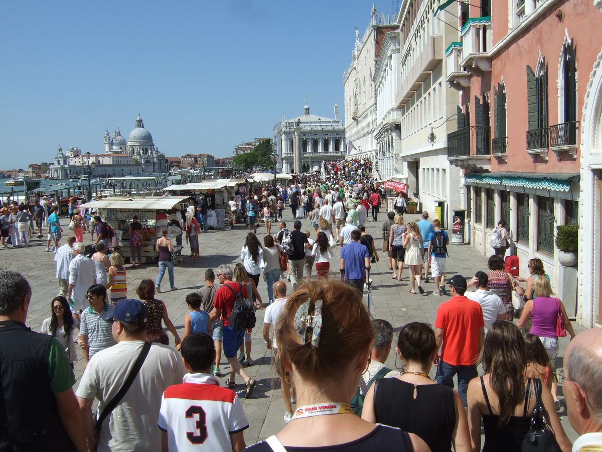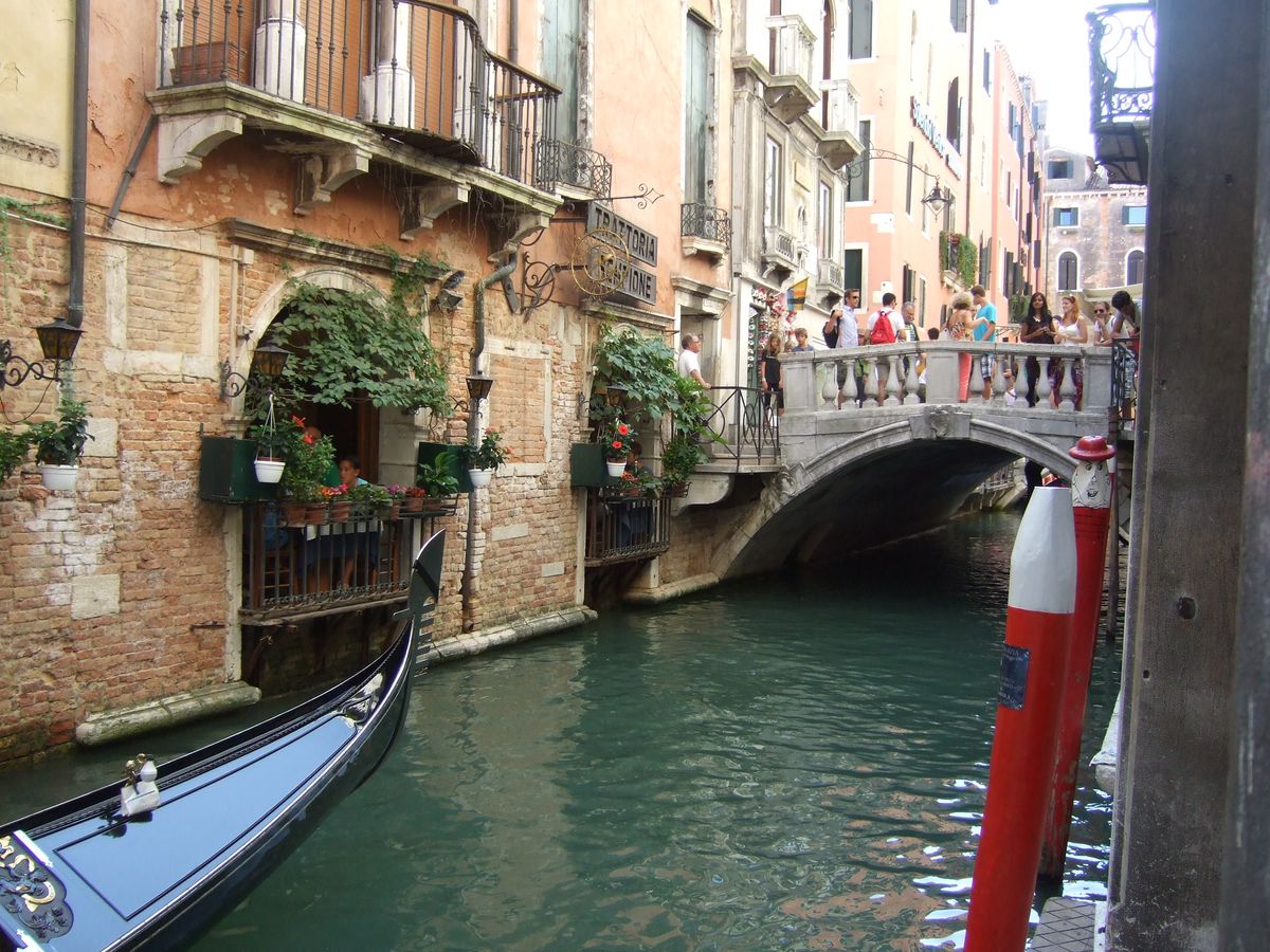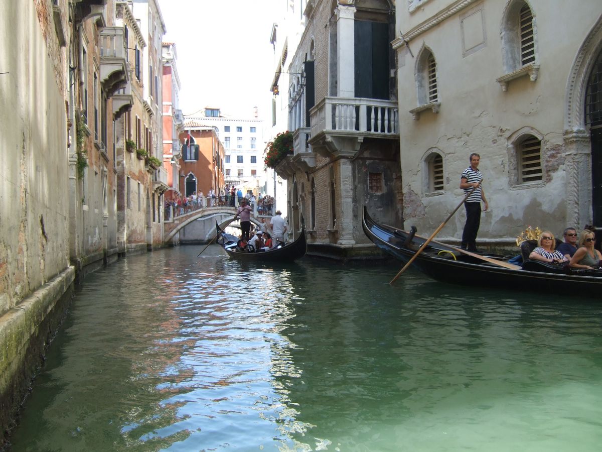 12時半頃サンマルコ広場で説明を受けた後、家族3人で観光する旨ガイドさんにお願いし、一行を離脱しました。サンマルコ寺院に入り、テラスからの景色を楽しみましたが、眼下の広場には人があふれかえっていました。この暑い中でも、さすが世界的な観光地!広場から中心部へのメインストリートはものすごく混んでいましたが、少し外れるとすいていたので、食事をしてショッピングを楽しみながら、リアルト橋まで歩きました。