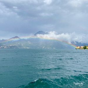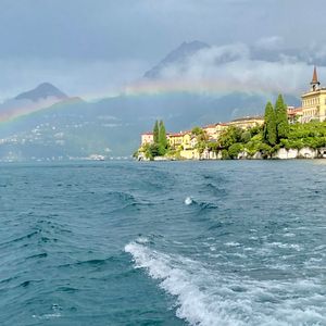 当日、湖水地方は豪雨の予報でした。でも幸い、現地に着くと薄ら陽が差し始め、クルーズ船に乗ってしばらくすると、美しい虹が立ちました。雲間に青空も垣間見え、絶好の観光日和になりました。気温は15度を下回り、厚手のセーターが欲しいほどでした。1時間ほどでベッラージョの船着場に着きました。土産物や服飾を扱う小体な店舗が軒を連ねていましたが、目ぼしいものは何もありません。いささか退屈して、オリーブ畑の中を越えて石畳の道を下っていくと、観光客がほとんどいない別荘地になっており、静かな船泊に出ました。遠くに急峻な山が聳え、翡翠色の湖水がヨットの船端を洗っていました。絶景です。ぜひここまで足を伸ばしてください。