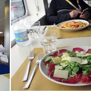 遊覧船でのランチは水+グラスワイン+前菜+メイン+デザート+コーヒー又は紅茶がでました。料金もリーズナブルで船の窓から景色を見ながらの食事はよかったです。