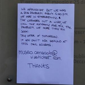 12時頃に確認のため、バアチャーをチケットに交換して、ロッカーを確認して食事から返ってくると、13時頃に突然中止張り紙です。こんな時のフォローアップを今後お願いします。