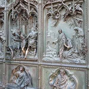 さらに、ドゥオモの入口で、ガイドさんの説明。キリストの足をスリスリ。