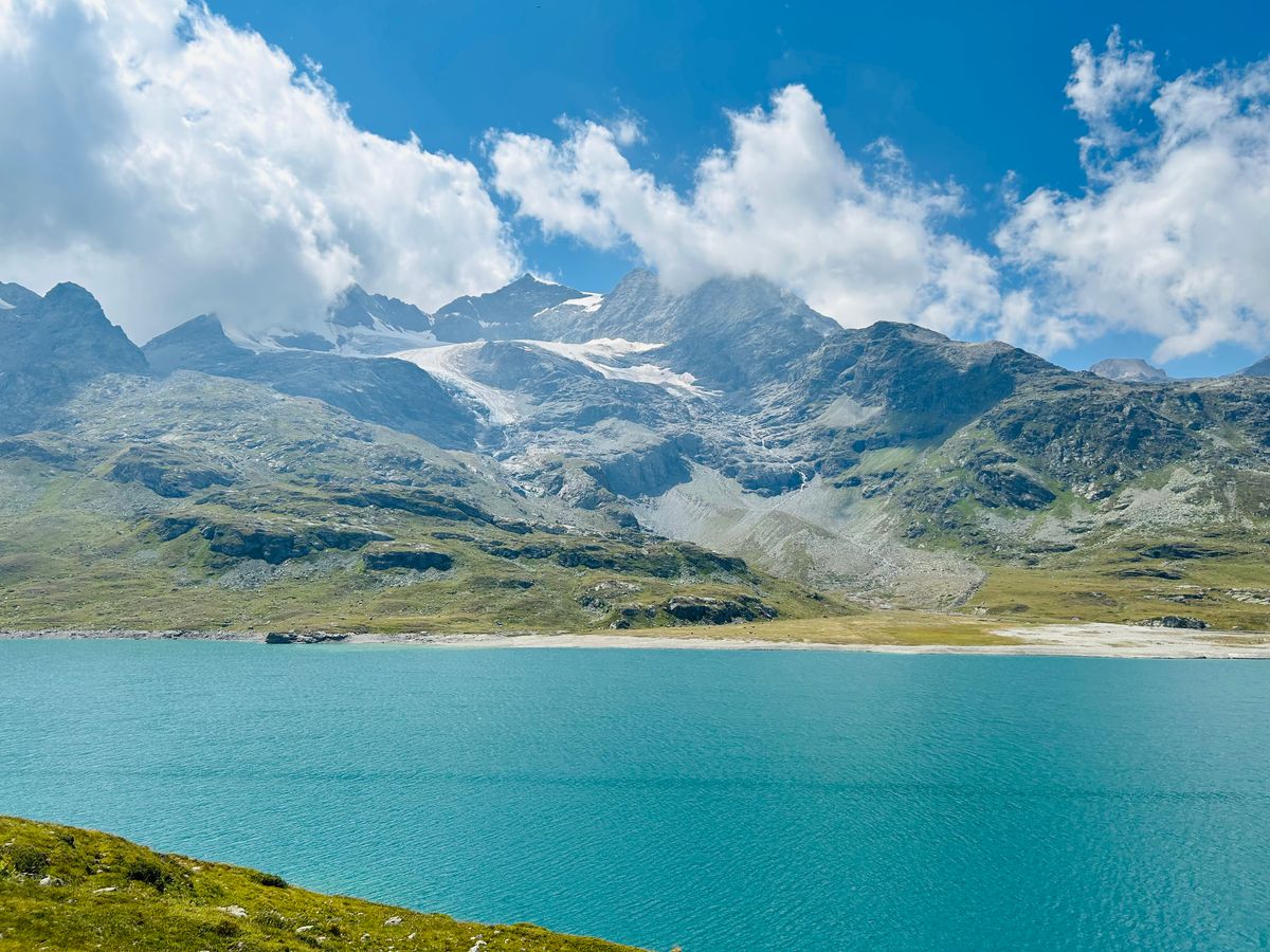 そして、いよいよツアーのメインイベント、ベルニナ列車に乗車します。列車は急行ではなく普通列車でしたが、窓を開けられるので風を感じながら写真も綺麗に撮影でき、急行よりも寧ろお勧めです。夏でしたが、氷河が残る山々、そして湖の美しさは忘れられません。列車は、左右どちら側に座っても綺麗な景色をみることができますが、ループ橋を綺麗に撮影したいのであれば、スイスからイタリアに向かう場合は右側、イタリアからスイスに向かう場合は左側の座席に座るのが良いでしょう。