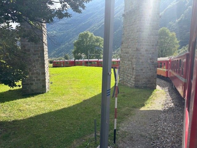 ベルニナ鉄道でどちら側の座席に座るかは結構重要です。もちろん、両側それぞれ楽しめますが、クライマックスのループ橋を楽しめる側がベストかと…