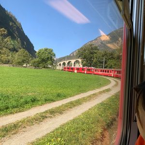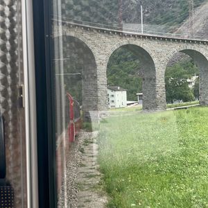ベルニナ特急は1等車が2車両しかないが、当日は自分も含め2車両で3家族(9名)しか乗車しておらず前後左右移動し放題だった。パノラマ席は窓が開かないが、車掌さんにデッキの窓が開く箇所を教えてもらい、この写真を撮影。ループ橋の動画もバッチリ撮れて気分は世界の車窓からだった。