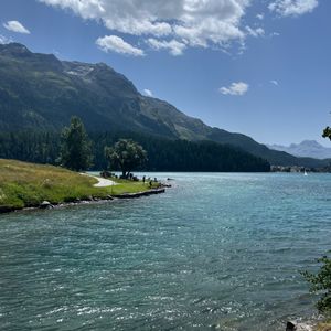 まずは、サンモリッツの中心街へ行き散策。coopの近くにあるトイレ(無料)へ行き、coopでお昼用のサンドイッチとオレンジジュースを買いました。その後、一通り街をブラブラし、オードリーヘップバーンやダイアナ妃が足繁く通った焼き菓子店へ行きクッキーとチョコレートをお土産として購入。そのまま、サンモリッツ駅に戻りコインロッカーに荷物を預け、いざ湖畔へ!4〜5キロほどの湖畔ですので、ベルニナ出発までには十分な時間がありました。途中、日陰のベンチに座りサンドイッチとジュースを頂きなからランチ休憩。ゆっくりと歩いても1時間半ほどで一周できます。周りの絶景を堪能しなからスイスを満喫しました。